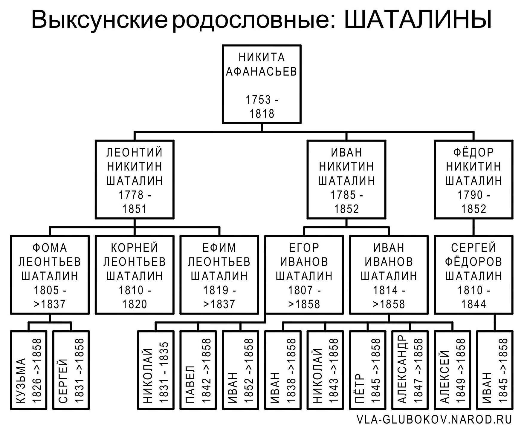 Выксунские родословные: ШАТАЛИНЫ Потомок халтуринских крестьян, а впоследствии молотовой подмастерье на Гусевском заводе, Никита Афанасьев, достался по разделу Ивану Родионовичу Баташёву. Его перевели на Выксунский завод, где в 1795 году он работал молотовым мастером. Все потомки Никиты Афанасьева известны под фамилией Шаталины. В 1801 году семья его старшего сына, Леонтия Никитина, была переведена на Верхне-Железницкий завод. В 1837 году Фома и Ефим Леонтьевы были отданы в рекруты. |